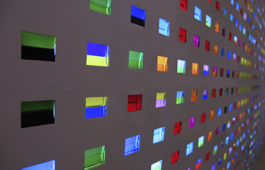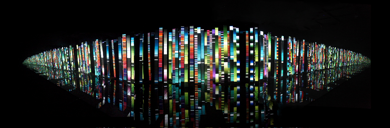 Projected across an uneven, six-meter wide barrier of tall, thin, vertical slats, a myriad of natural and artificial objects absorbs the viewer’s field of vision, including vastly enlarged blood cells, swirling flower petals, sharp-edged geometric forms, and crackling 1V static. Small points of light zoom together to form a complex globular cluster, and later fly apart in a burst reminiscent of the titanic explosion that began time and gave birth to the universe. At one point, small white spots of light descend the face of the installation against an ascending flow of bright colors, like the fall of individual souls into the world of matter and the promise of their subsequent ascent as pure spirit. The impassive rectangular panels that form the screen for this drama recall a loose gathering of Alberto Giacometti’s emaciated figures, hinting that the divergent worlds within our minds are as important to the communal unfolding of reality as the guiding hand of some great but invisible cosmic architect. The astounding proqression of hauntingly beautiful images in Windows of the Soul affects us in much the same way the primal portraits of life in the Lascaux caves must have struck their viewers in the flickering firelight. We feel the mystery of divine emanation spilling out before our eyes and recognize that the primordial act of creation renews itself every single moment.